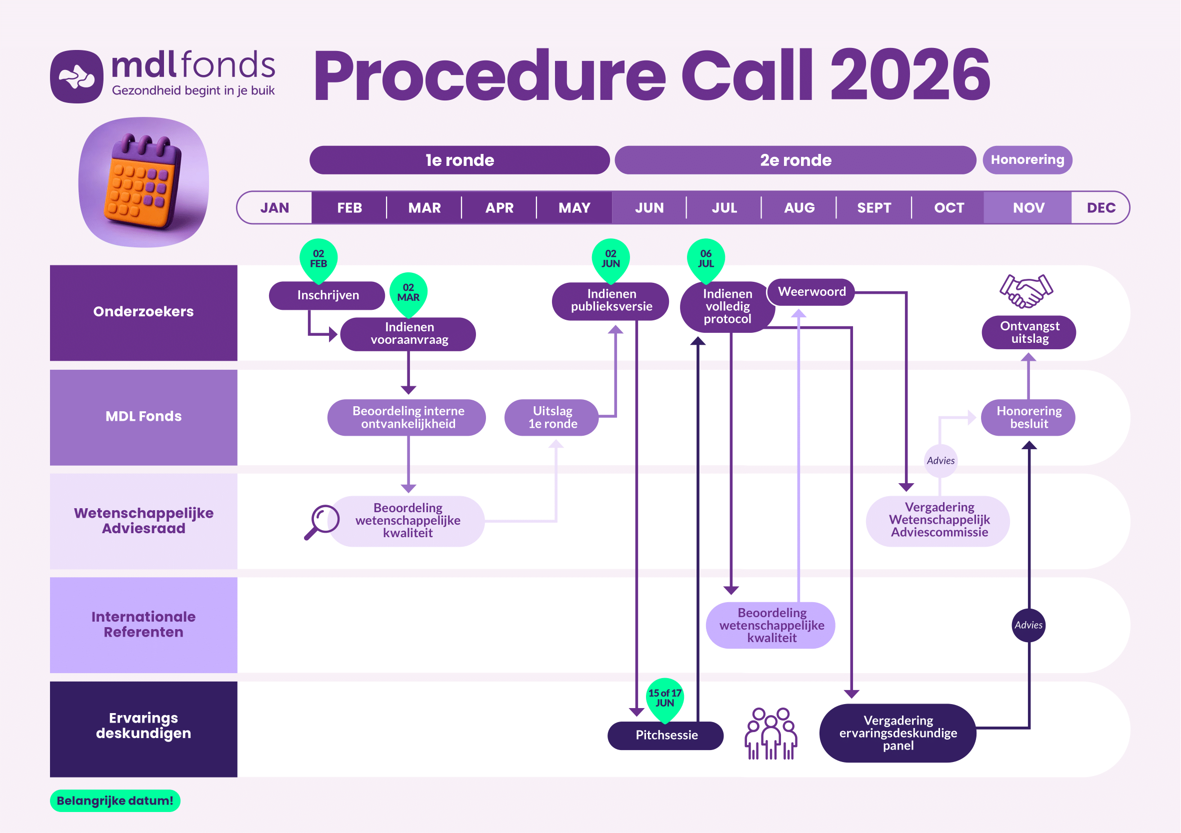 - 2 februari 2026 om 12.00 uur: Deadline voor het aanmaken van een account en het aanleveren van titel, onderzoeksthema en leden onderzoeksgroep, via www.subsidieportaal-mdlfonds.nl.
